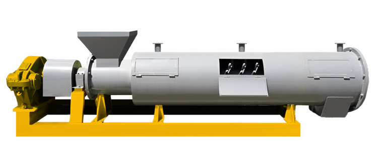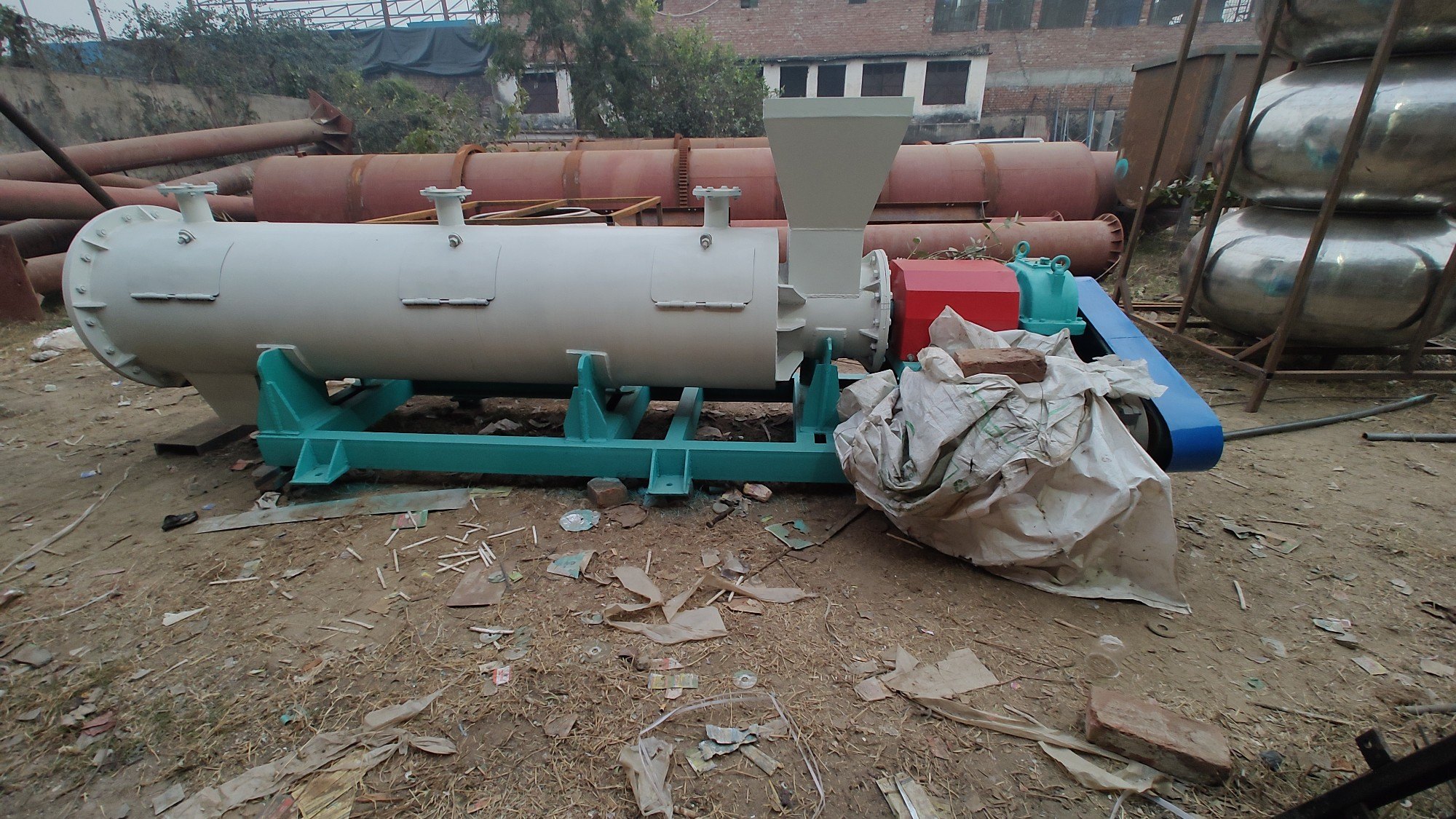 Powdered organic material is fed into a horizontal drum, where high-speed agitation teeth break up agglomerates and generate intense mechanical agitation. The combined effects of agitation and wetting cause the material to bond, forming dense granules. The granules are then discharged for drying and further processing.